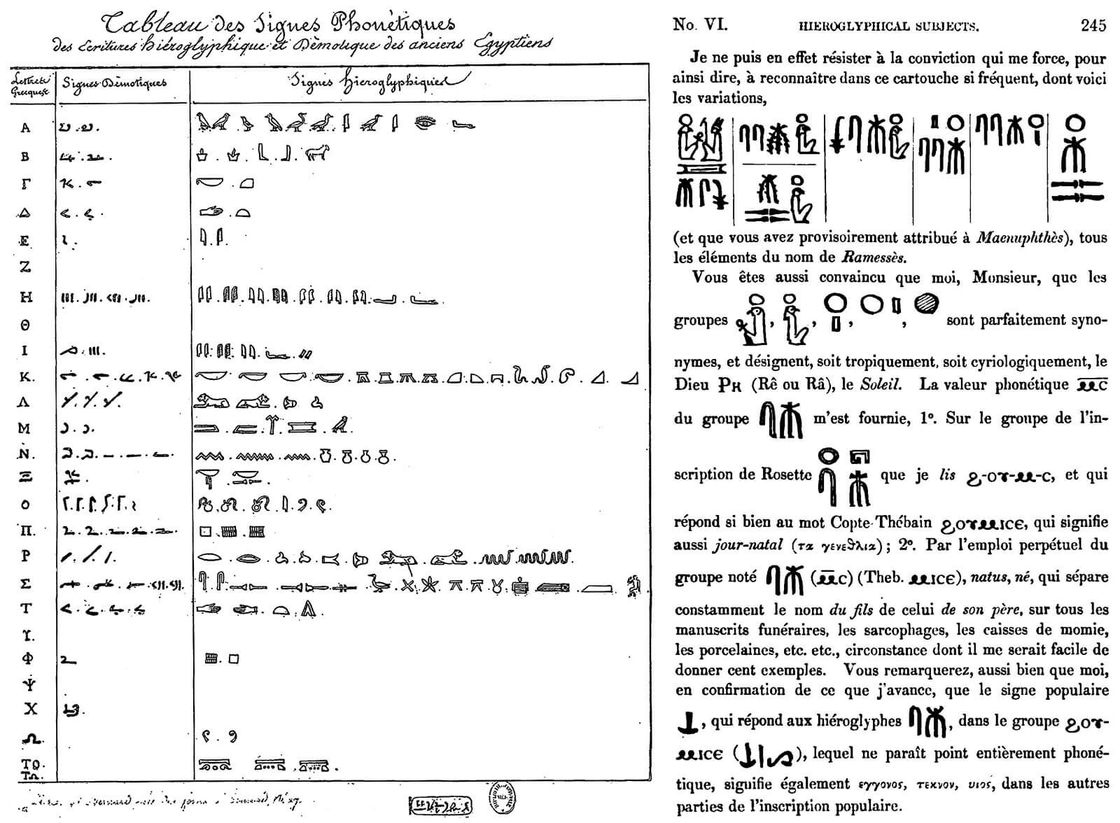 Sol: “M. Dacier’e Mektup”, 27 Eylül 1822 — fonetik hiyerogliflerin listesi.